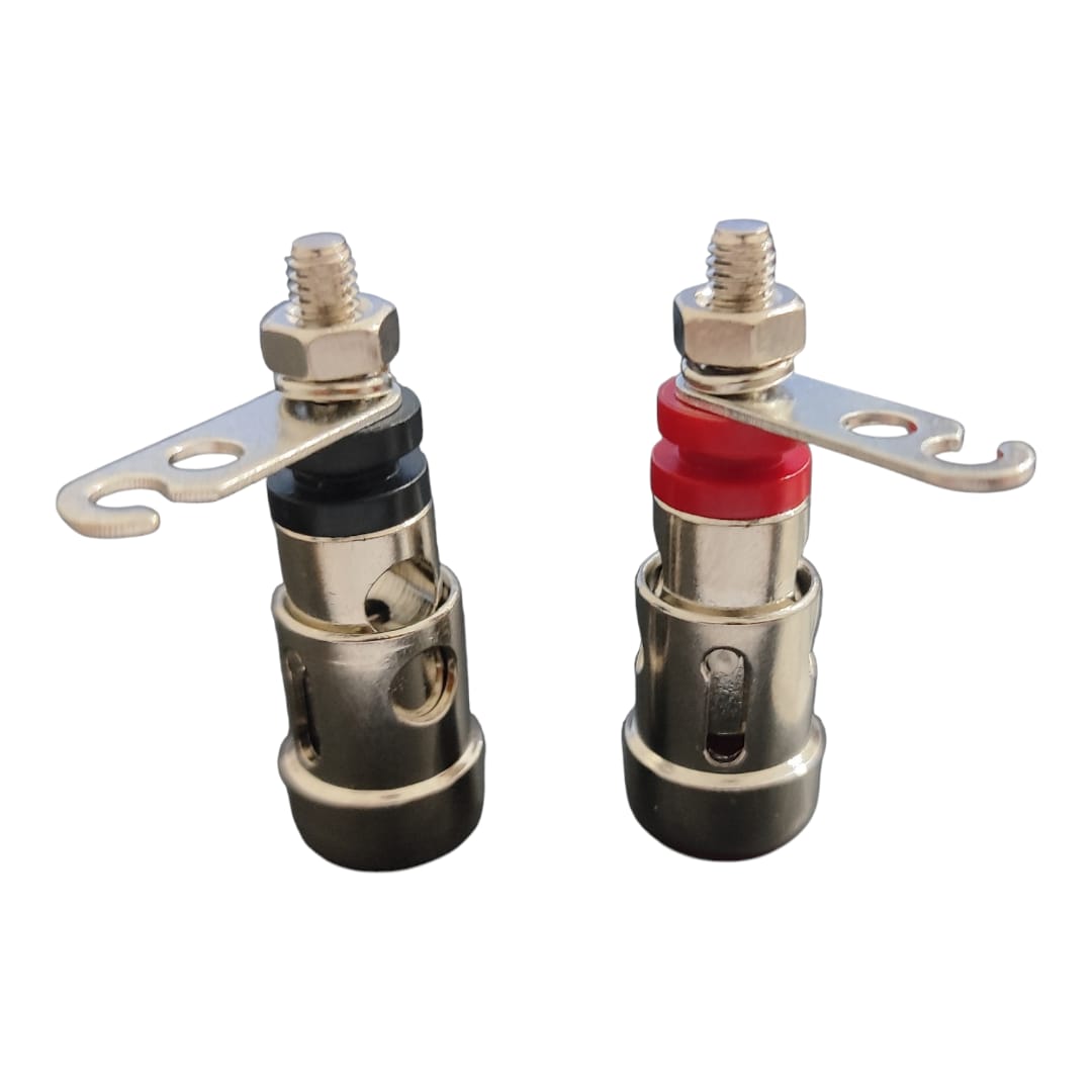 BORNE DE PRESSÃO (O PAR) - Conexão rápida, firme e com áudio de alta qualidade O Borne de Pressão oferece uma conexão confiável para alto-falantes, garantindo transmissão de áudio limpa e segura. Ideal para sistemas de som residenciais ou profissionais, permite conectar e desconectar cabos de até 4 mm com facilidade, sem danificar os fios. Projetado para oferecer durabilidade e excelente desempenho elétrico, é a escolha perfeita para quem busca praticidade e qualidade na instalação de caixas acústicas e alto-falantes. CARACTERÍSTICAS DO PRODUTO: - Estrutura em latão com tratamento em níquel - Terminal em latão com 0,8 mm de espessura - Porca metálica para fixação firme - Peças plásticas em polipropileno, proporcionando excelente isolamento elétrico - Mola interna em aço com tratamento em níquel